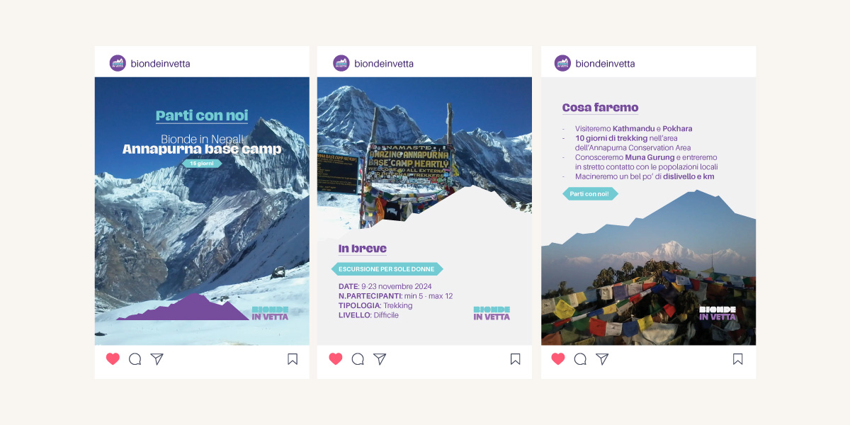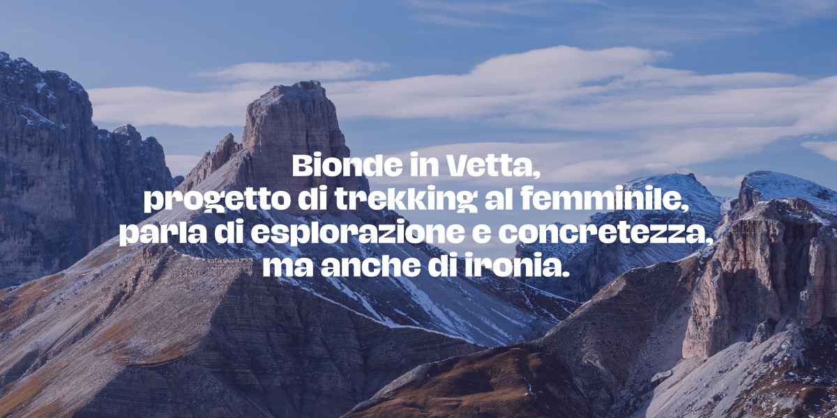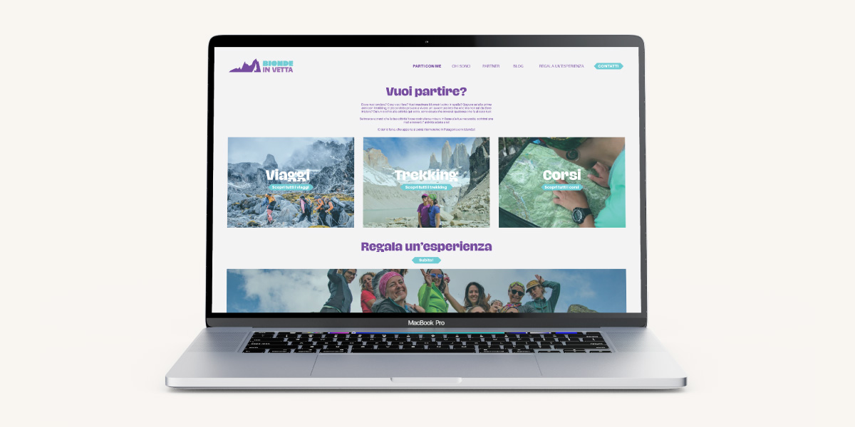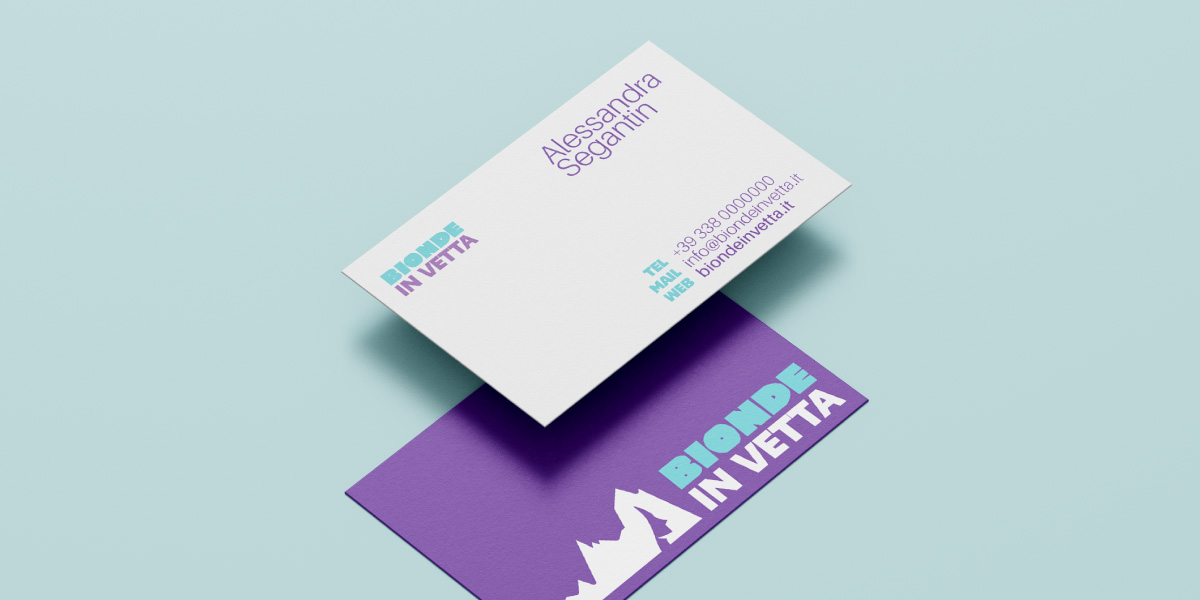 Per Alessandra ho lavorato su un rebranding coerente con il suo modo di vivere la montagna, senza rinunciare a valorizzare la parte estetica. Così Patagonitana (il nome precedente del brand) è diventato Bionde in Vetta: un nome che si prende un po’ di spazio, ribalta uno stereotipo e dichiara un’intenzione.