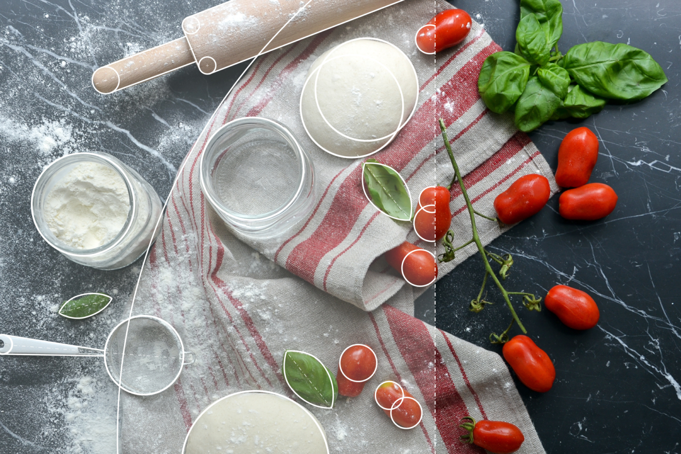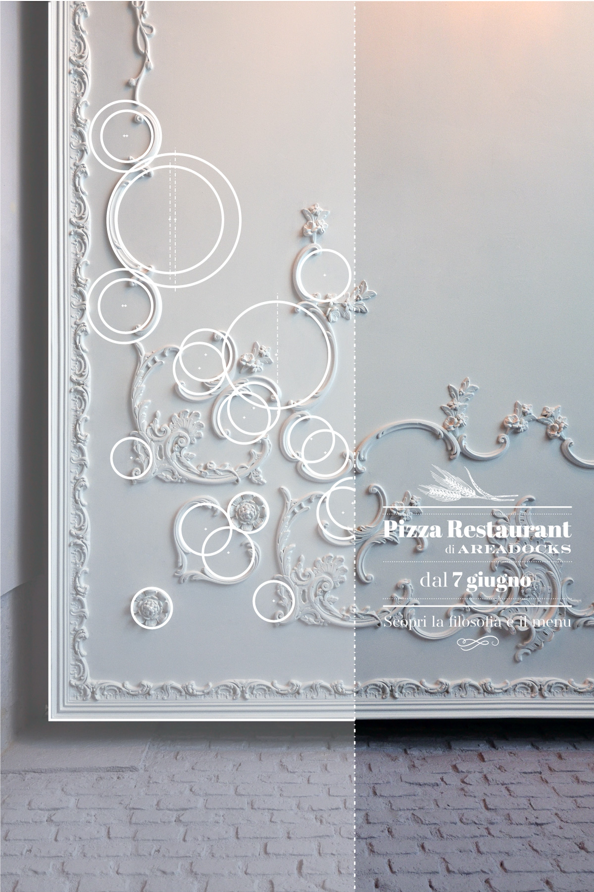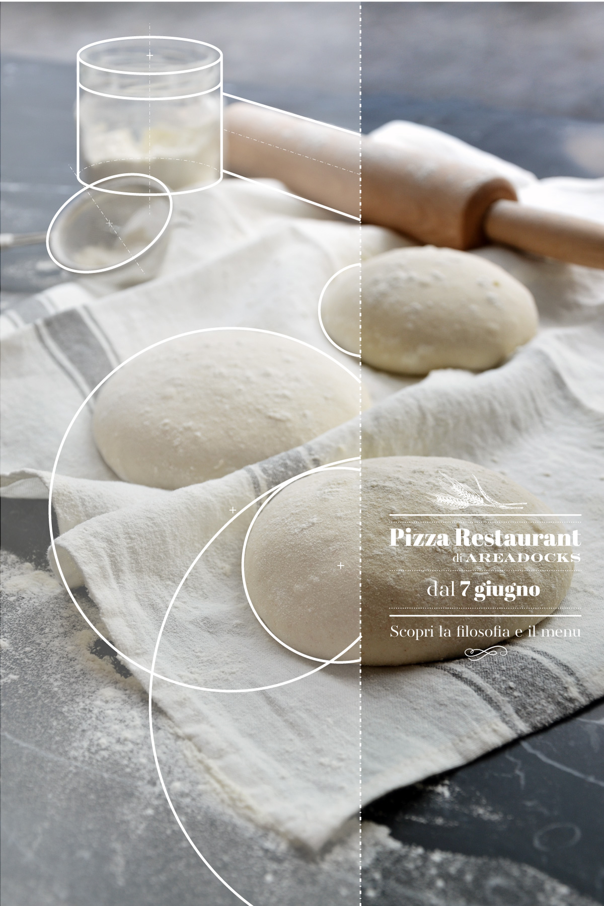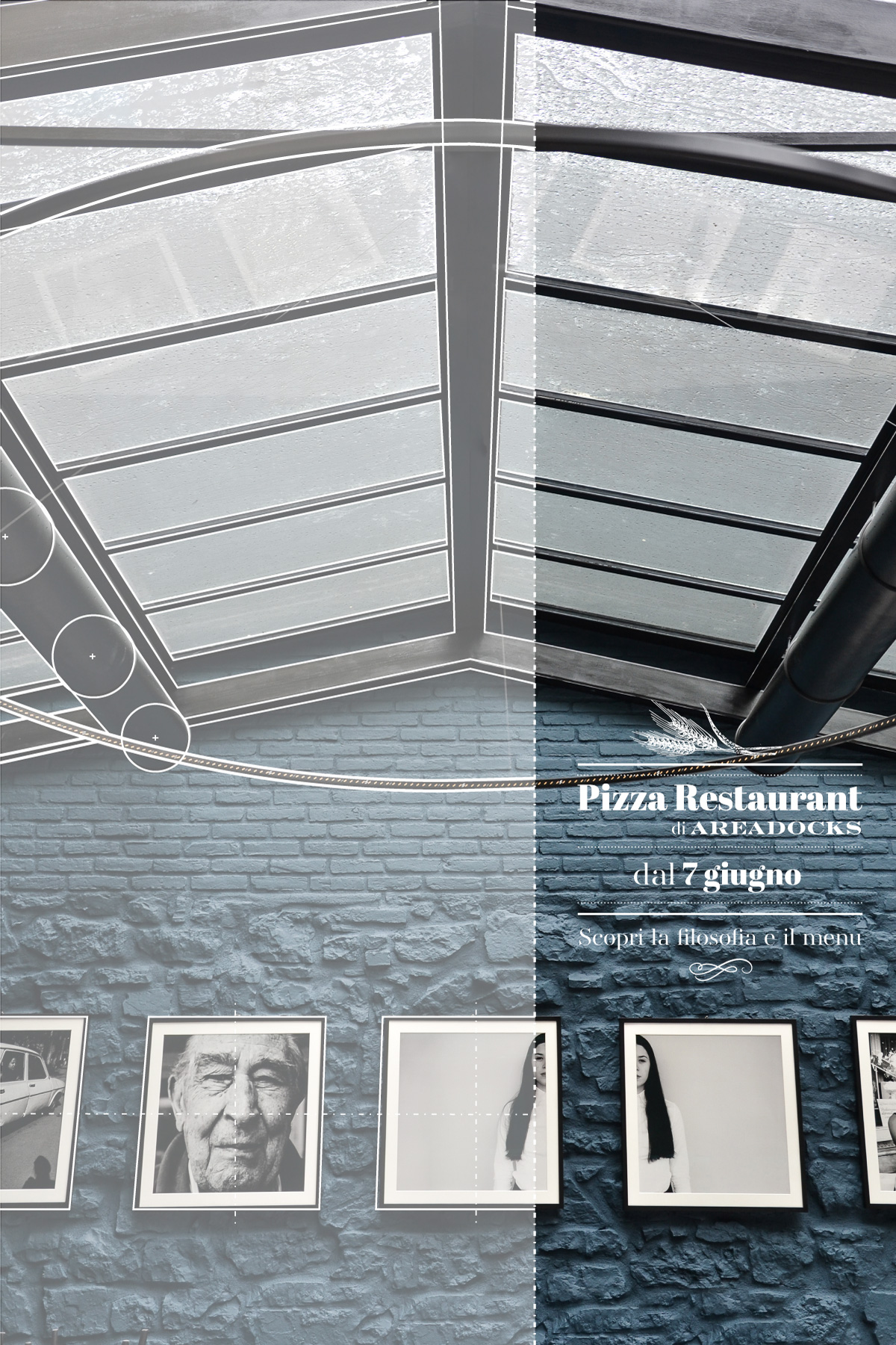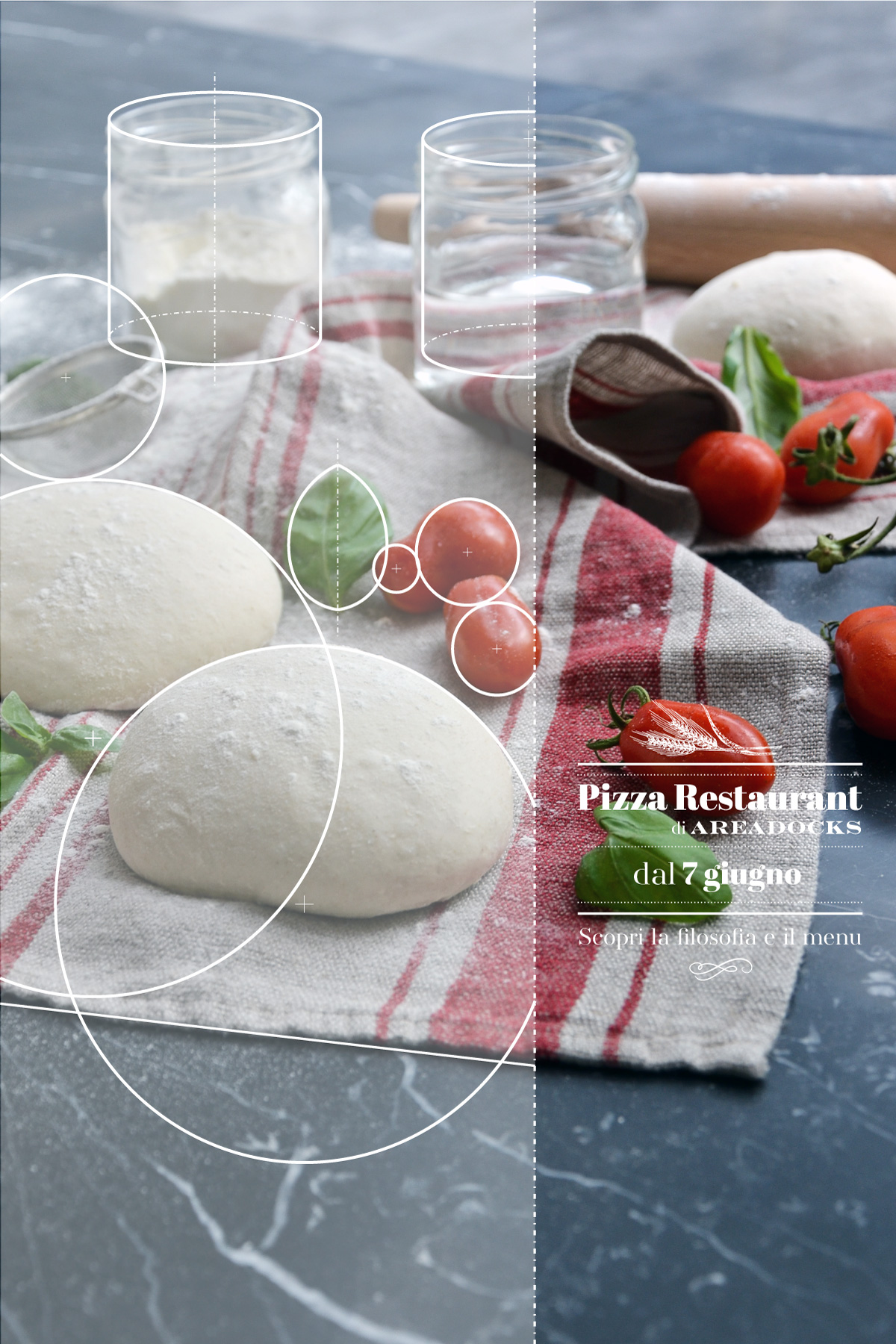 Ho lavorato alla comunicazione per l’evento di inaugurazione puntando proprio sugli elementi peculiari dell’arredo e dell’architettura, affiancandoli agli ingredienti usati per la pizza, entrambe “materie prime” di Areadocks & la Pizza. Partendo dal concetto di inaugurazione di un nuovo spazio in un ambiente molto dinamico come quello di Areadocks ho subito pensato al tema del progetto e della costruzione, e ho fotografato gli spazi ancora in fase di allestimento (o gli ingredienti non ancora trasformati in pizza) e ricostruendo sulle foto una sorta di griglia di costruzione geometrica, ricavando le forme prime, gli assi di simmetria e le centrature.