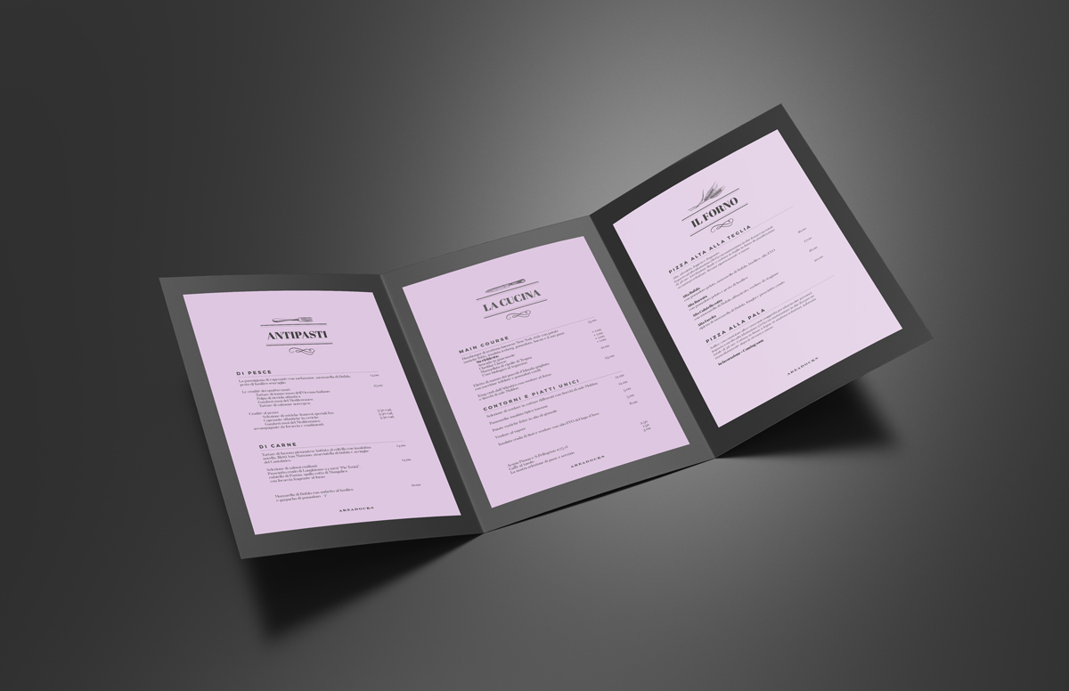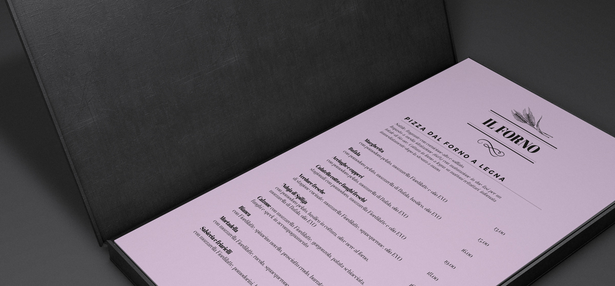 Anche per quanto riguarda il progetto dei menu ho deciso di mantenere un’estetica coerente utilizzando gli stessi font delle grafiche per l’inaugurazione del nuovo spazio e mantenendo uno stile un po’ liberty e sottilmente vintage. I menu sono rilegati in pelle nera e ho deciso di stampare le pagine su carta lilla, come la parete d’ingresso del locale (visibile nella foto degli stucchi).