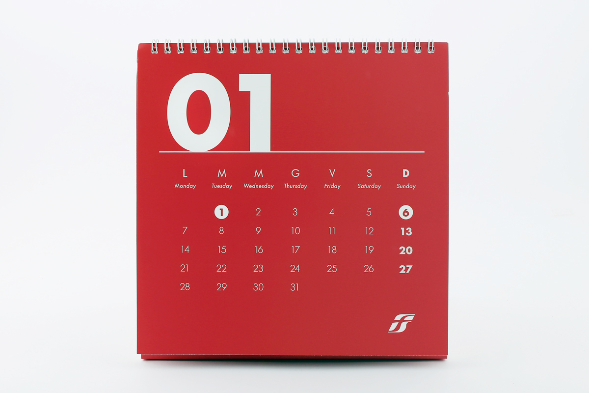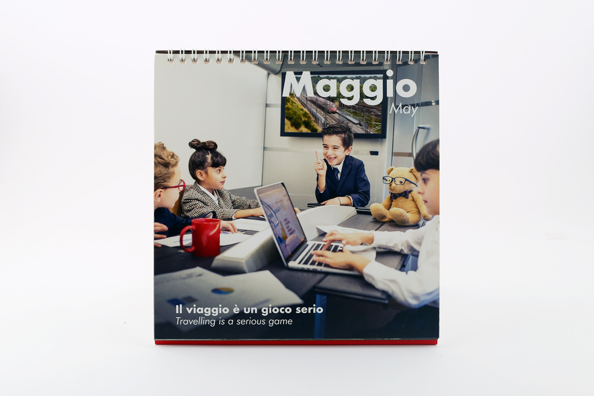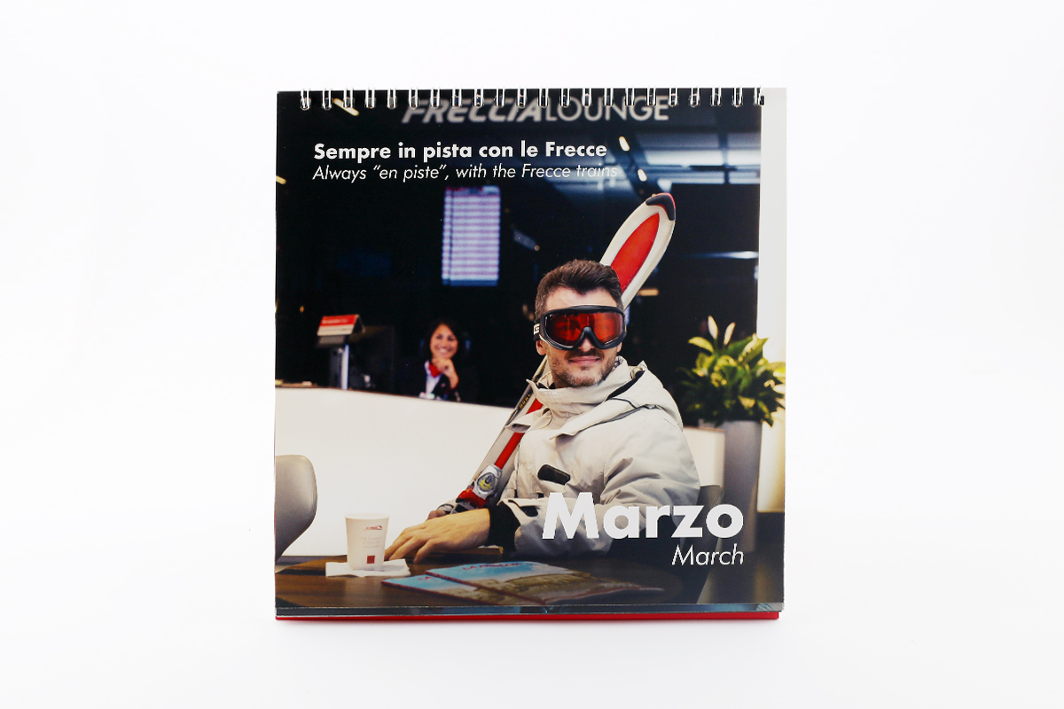 Ogni mese è accompagnato da una breve frase che racconta in breve l’immagine con un intento ironico. Per quanto riguarda la grafica invece mi sono basata sul brandbook che Gruppo FS ci ha fornito al momento della partecipazione al contest, mantenendo colori e font aziendali impaginando il calendario con un’impronta moderna, il mese evidenziato solo tramite il numero con una dimensione molto d’impatto e mantenendo la griglia molto pulita in bianco su rosso.