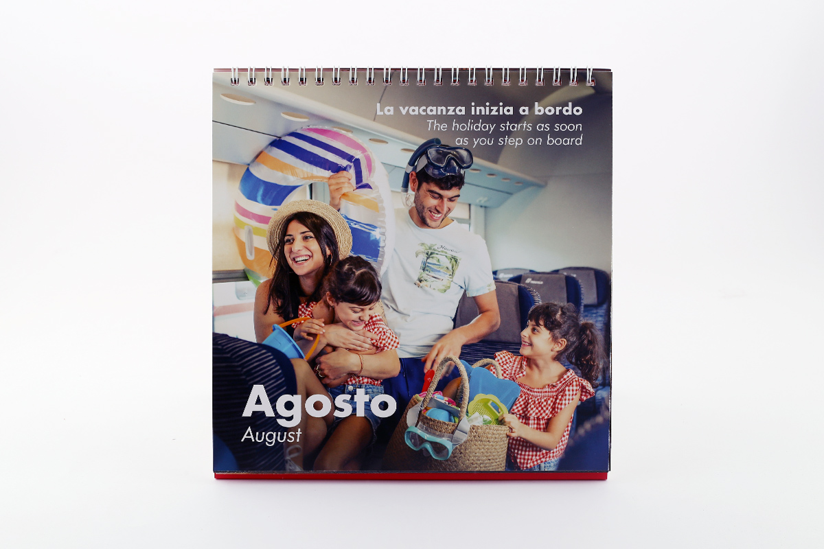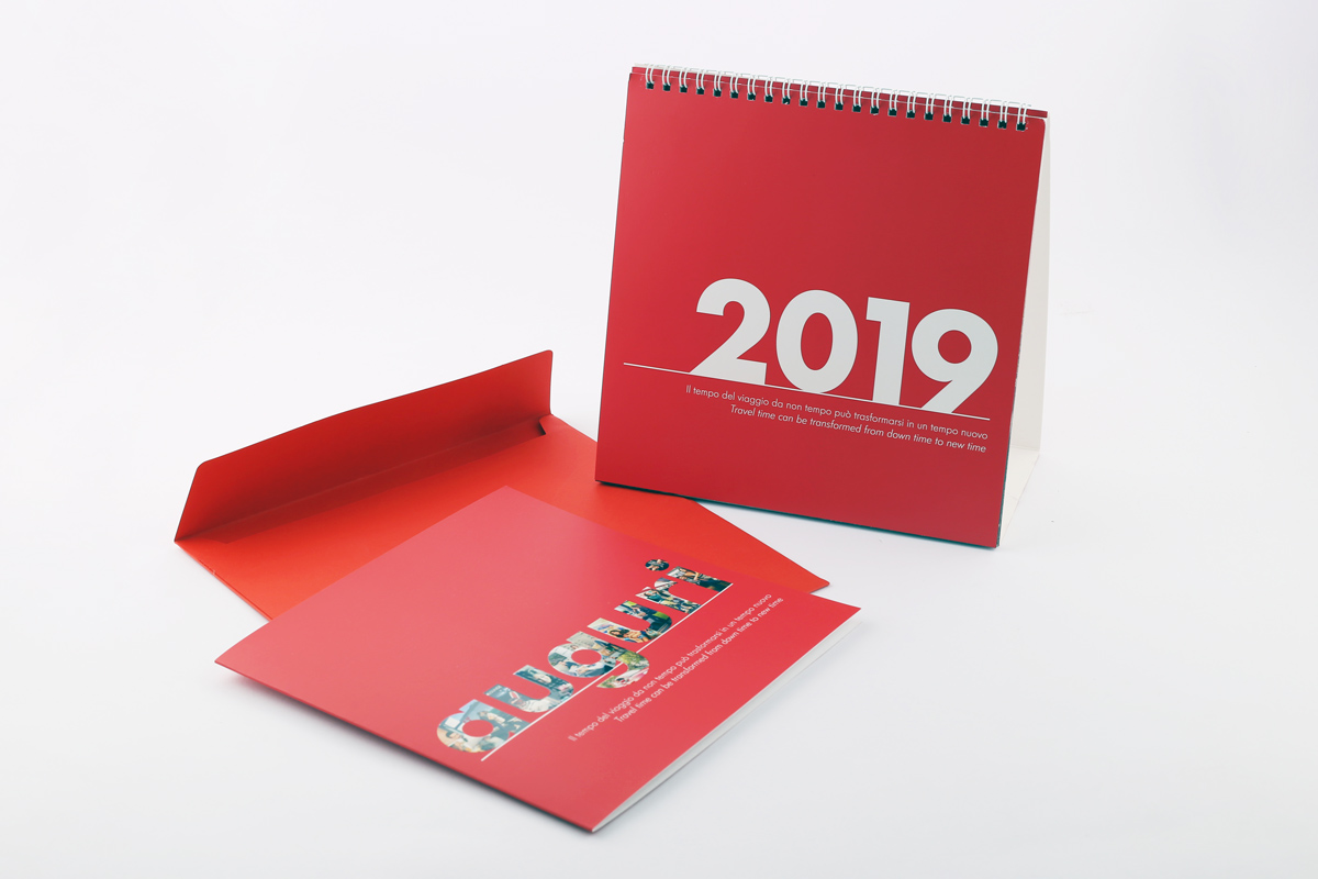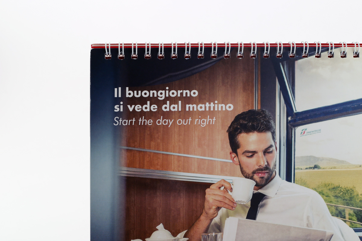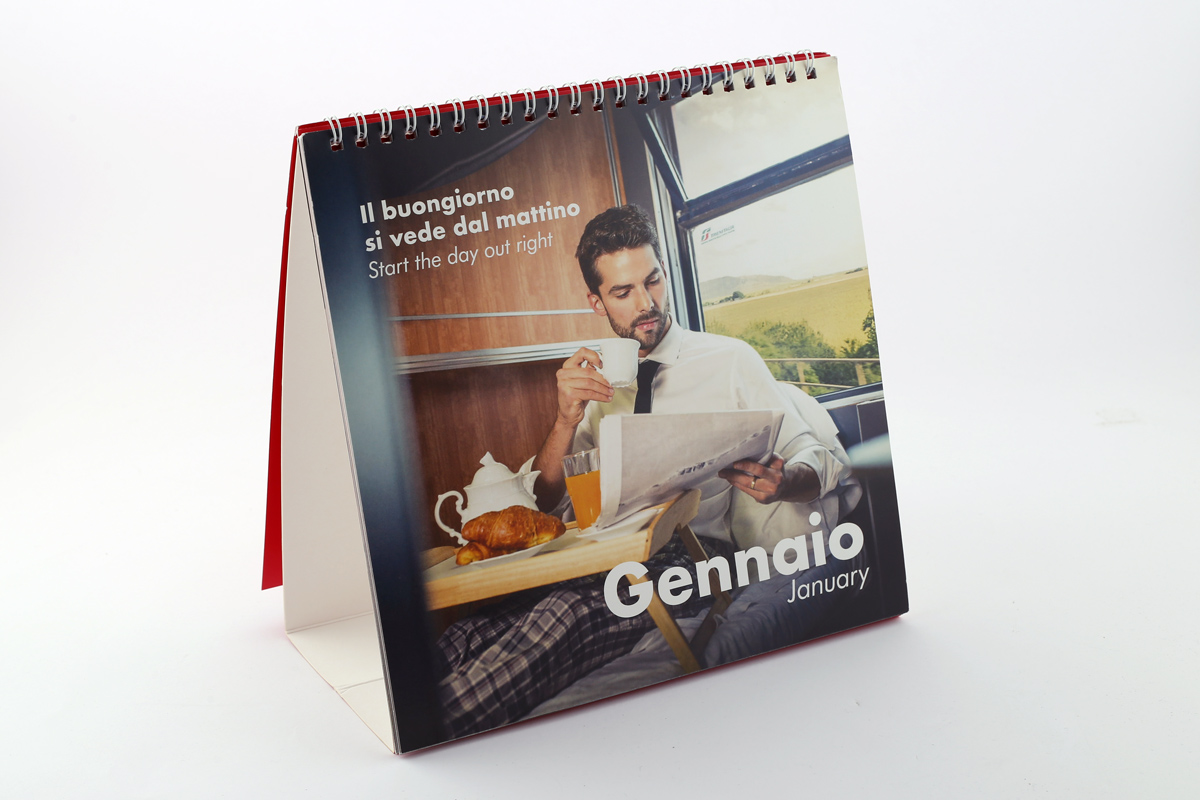Ogni mese è accompagnato da una breve frase che racconta in breve l’immagine con un intento ironico. Per quanto riguarda la grafica invece mi sono basata sul brandbook che Gruppo FS ci ha fornito al momento della partecipazione al contest, mantenendo colori e font aziendali impaginando il calendario con un’impronta moderna, il mese evidenziato solo tramite il numero con una dimensione molto d’impatto e mantenendo la griglia molto pulita in bianco su rosso.