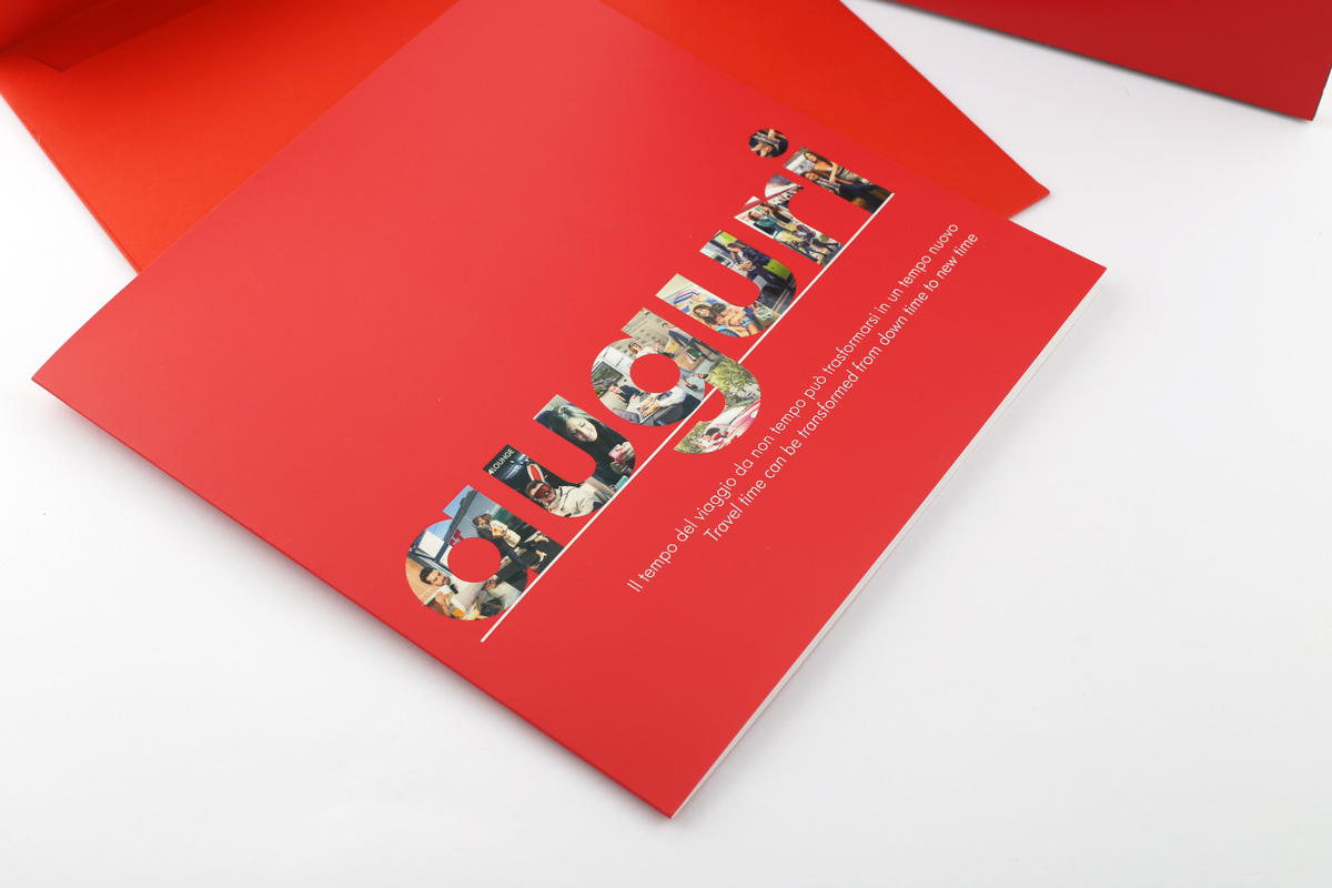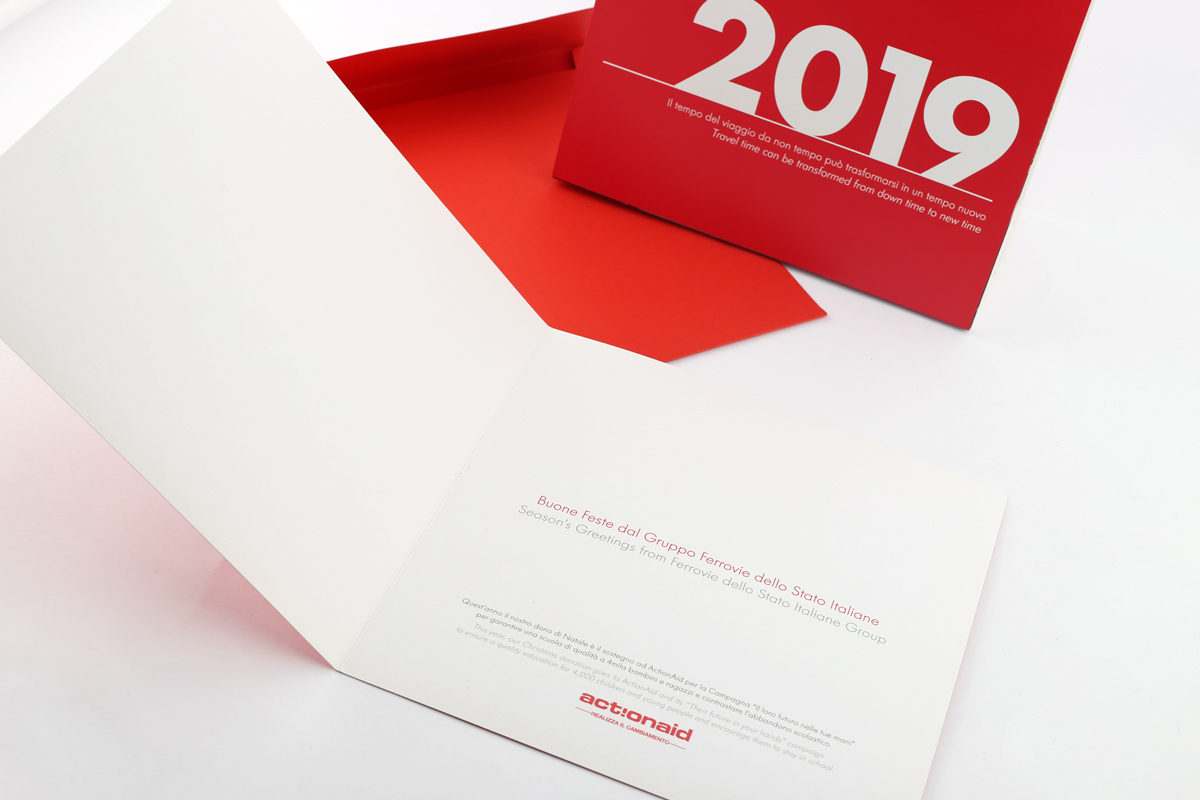 Insieme al calendario ci è stato chiesto di impaginare un cartoncino di auguri con la stessa identità visiva del calendario, in quanto destinato ai dipendenti del Gruppo. Per questo ho deciso di mettere in prima pagina la scritta auguri composta da tutte le foto del calendario, stampata con verniciatura UV a rilievo. All’interno semplicemente un augurio di Buone Feste.