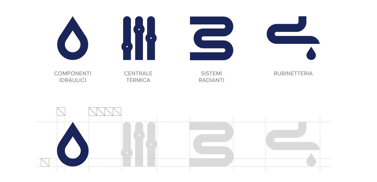 Un passaggio importante nella definizione dell’identità visiva di Tiemme è stato sicuramente quello del disegno delle icone descrittive delle divisioni aziendali, che verranno adattate sui vari materiali corporate per suddividere meglio le aree di business dell’azienda e al contempo parlare di offerta integrata. Vengono usate sui materiali commerciali e su quelli destinati al pubblico, non sono previste invece sui materiali destinati all’uso interno (es. agende) e su quelli molto piccoli (es. biglietti da visita). Per disegnarle mi sono ispirata alle linee della grafica svizzera, rigorosa ma estremamente didascalica, e ho mantenuto uno spessore uniforme che si adattasse bene anche alle proporzioni del pittogramma.![]()